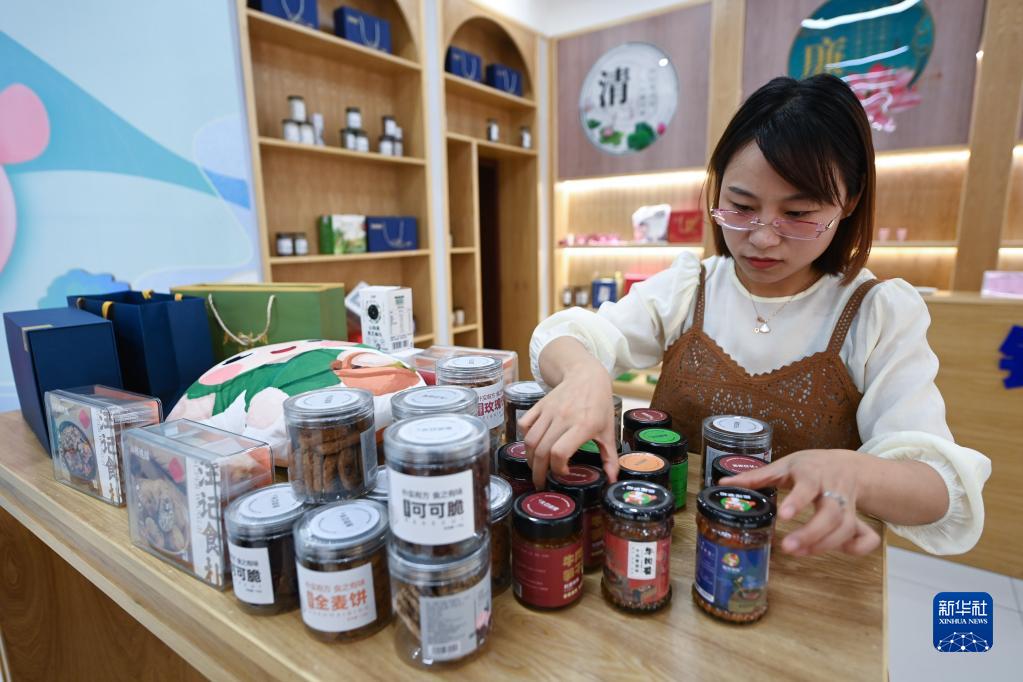 9月21日,在杭州市臨安區昌化鎮白牛村電商大樓的農創客中心,張青整理要進行直播銷售的特色農產品。張青回鄉聯合當地青年志愿者組建“云上白?!ね乃C”特色電商平臺,組織“農創客”開展直播培訓。