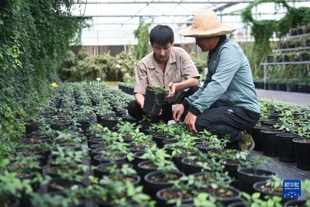 9月21日,在杭州市臨安區昌化鎮中草藥種植基地,郭二彪(左)給一農戶進行技術指導。農業專業研究生畢業的郭二彪目前是中草藥種植基地的技術骨干。
