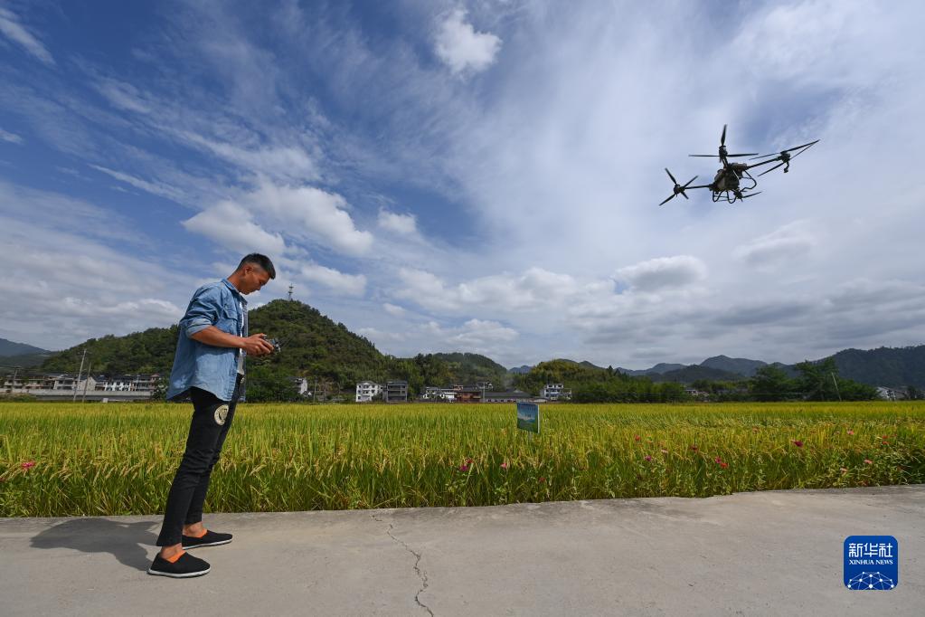 9月21日,在杭州市臨安區昌化鎮后營村,種糧大戶汪強操作農用無人機給水稻施肥。汪強與家人承包了1000多畝稻田,使用現代化農用機械進行規模種植。
