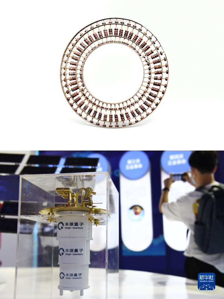 這是一張拼版照片:上圖為明代銅圓八卦算盤(安徽程大位珠算博物館供圖);下圖為在2022世界制造業大會上,合肥本源量子計算科技有限責任公司展出的24比特超導量子計算機模型(新華社記者周牧2022年9月20日攝)。