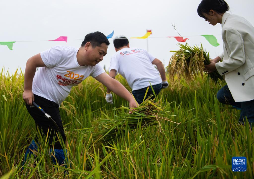 9月21日,在益陽市南縣麻河口鎮東勝村,當地村民和游客在比拼收割水稻。