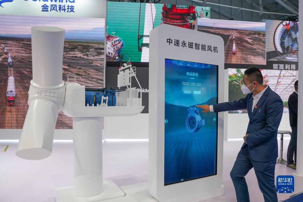9月21日,在第七屆中國-亞歐博覽會上,新疆金風科技股份有限公司展位的工作人員在介紹中速永磁智能風機。