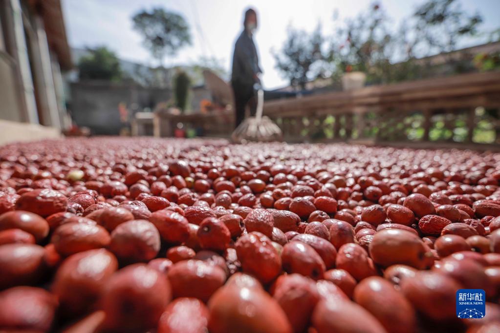 9月21日,河北省玉田縣孤樹鎮青石塘村的農民在庭院晾曬金絲小棗。