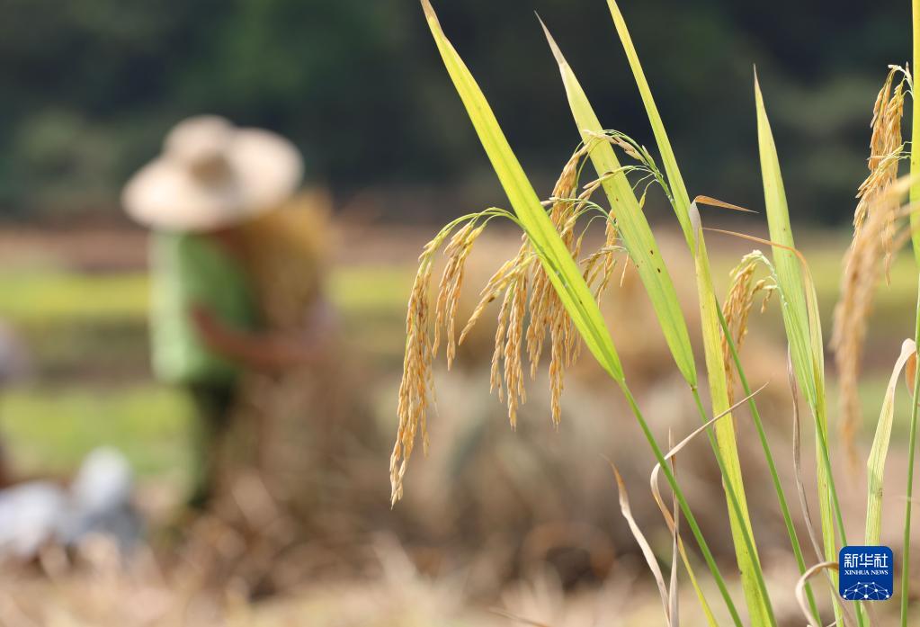 9月21日,湖南省永州市道縣梅花鎮貴頭村的村民在收割稻谷。