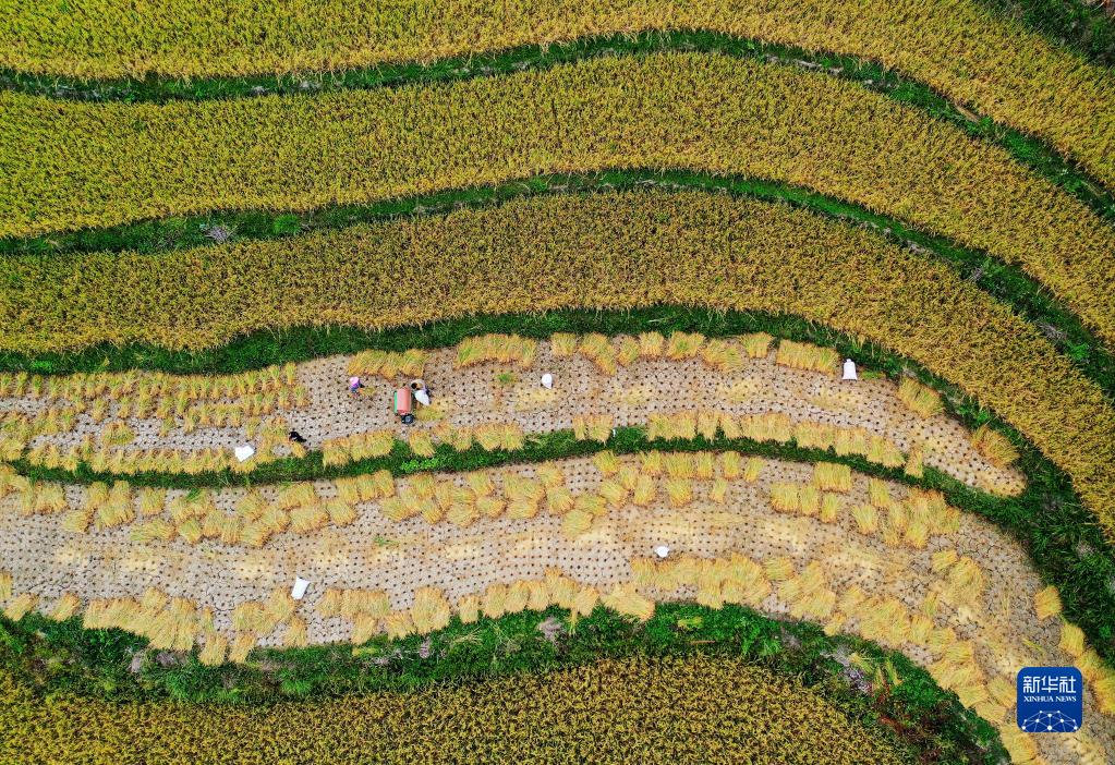 9月21日,貴州省黔南布依族苗族自治州福泉市牛場鎮雙龍村村民在稻田里收割水稻(無人機照片)。