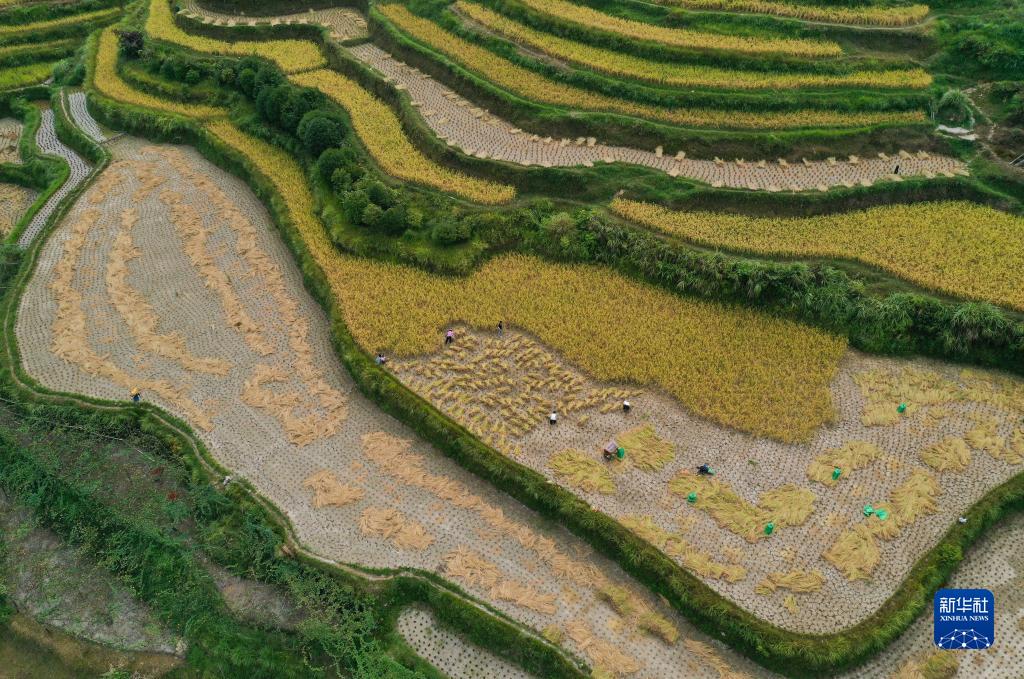 9月20日,貴州省黔東南苗族侗族自治州丹寨縣雅灰鄉上叢村村民在收獲水稻(無人機照片)。