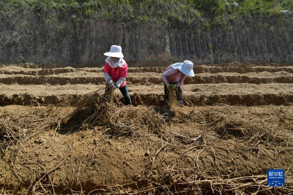 9月21日,農民在位于榆中縣貢井鎮的榆中宏鑫藥材專業合作社種植基地采收甘草。