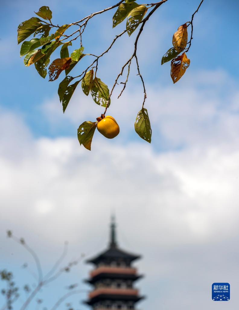 江蘇省揚州市瘦西湖風景區,成熟的柿子與棲靈塔相映成趣(9月18日攝)。