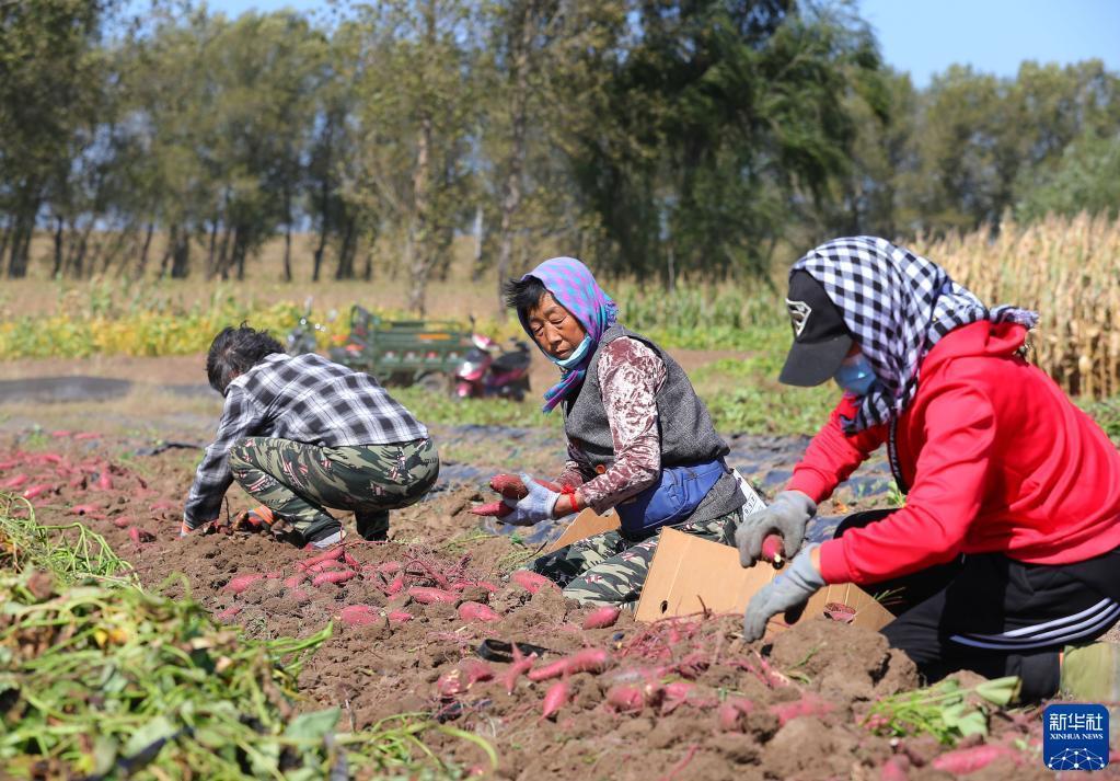 9月21日,在康平縣方家屯鎮十家子村,農民在地里收獲紅薯。