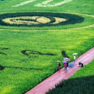 近日,重慶市大足區拾萬鎮長虹村隆平五彩田園豐收在即,巨型稻田畫勾勒出金秋壯美景象,吸引眾多游客前來打卡游玩。