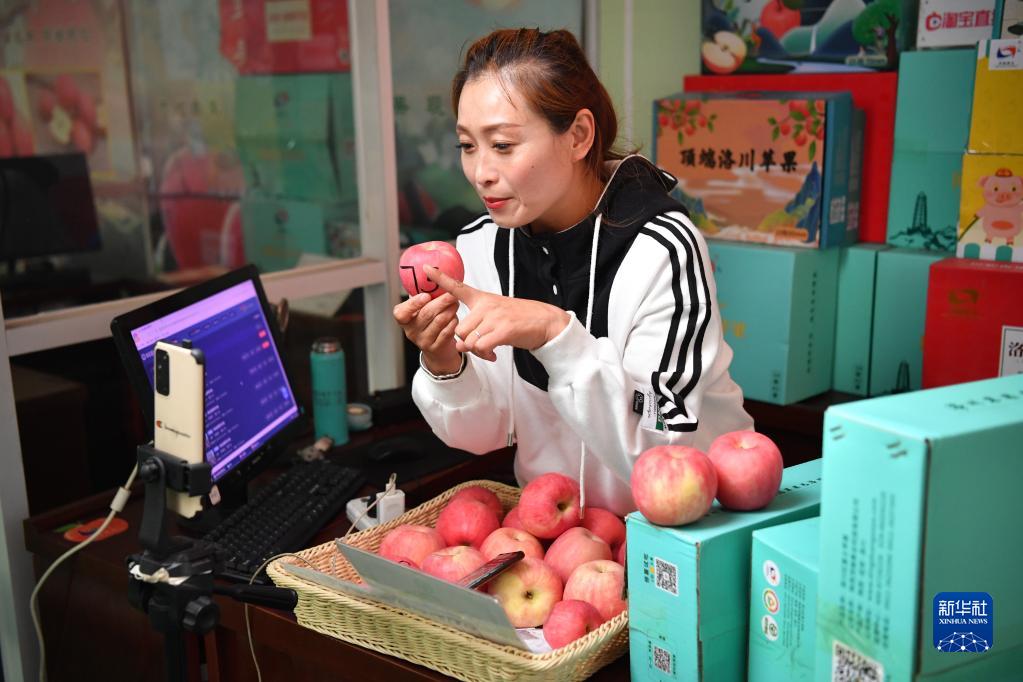 9月20日,在洛川縣一家果業公司的直播間內,工作人員直播銷售蘋果。