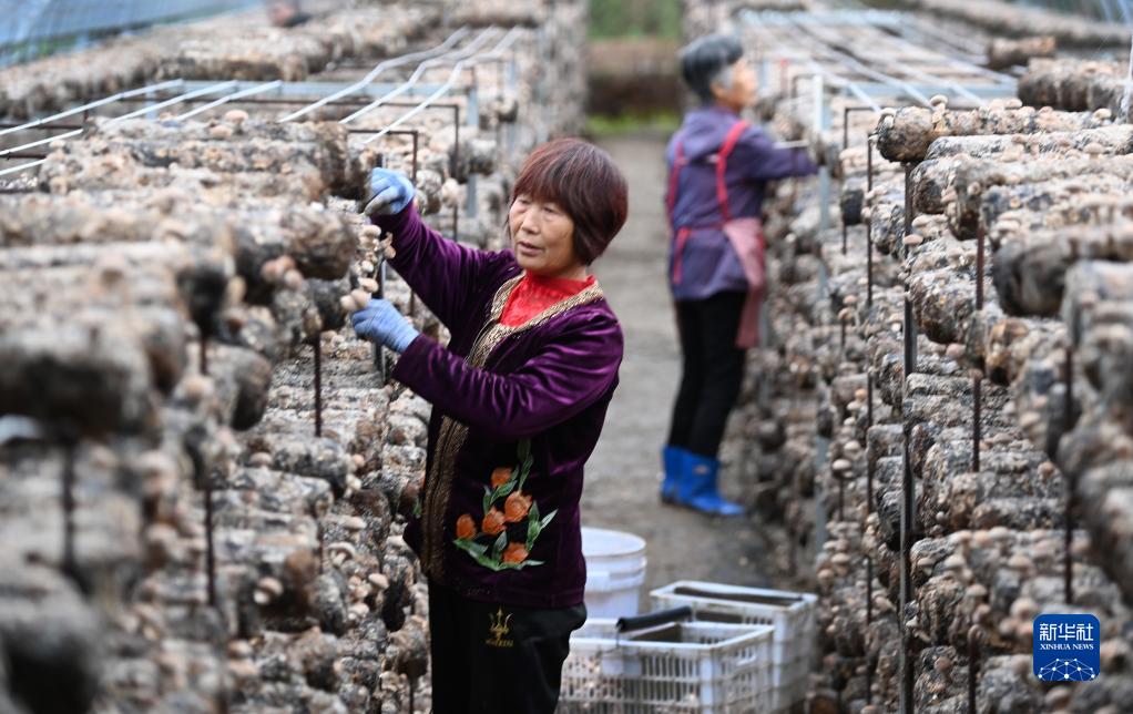 陜西漢中市城固縣桔園鎮陳家灣村村民在本村的股份經濟合作社香菇大棚采摘香菇(9月20日攝)。食用菌與中藥材、茶葉已被列為漢中全市鄉村振興的支柱產業。