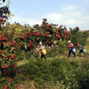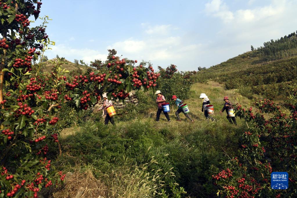 在山東省新泰市劉杜鎮南流泉村,紅彤彤的山楂掛滿枝頭,村民們忙著采摘、包裝、交易。劉杜鎮是遠近聞名的山楂產地,全鎮山楂種植面積2.3萬畝。