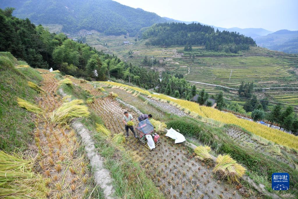 金秋時節,湖南省婁底市新化縣紫鵲界梯田的水稻進入成熟收割期。紫鵲界梯田是世界灌溉工程遺產和全國首批19個重要農業文化遺產之一,梯田層層疊疊連綿起伏。