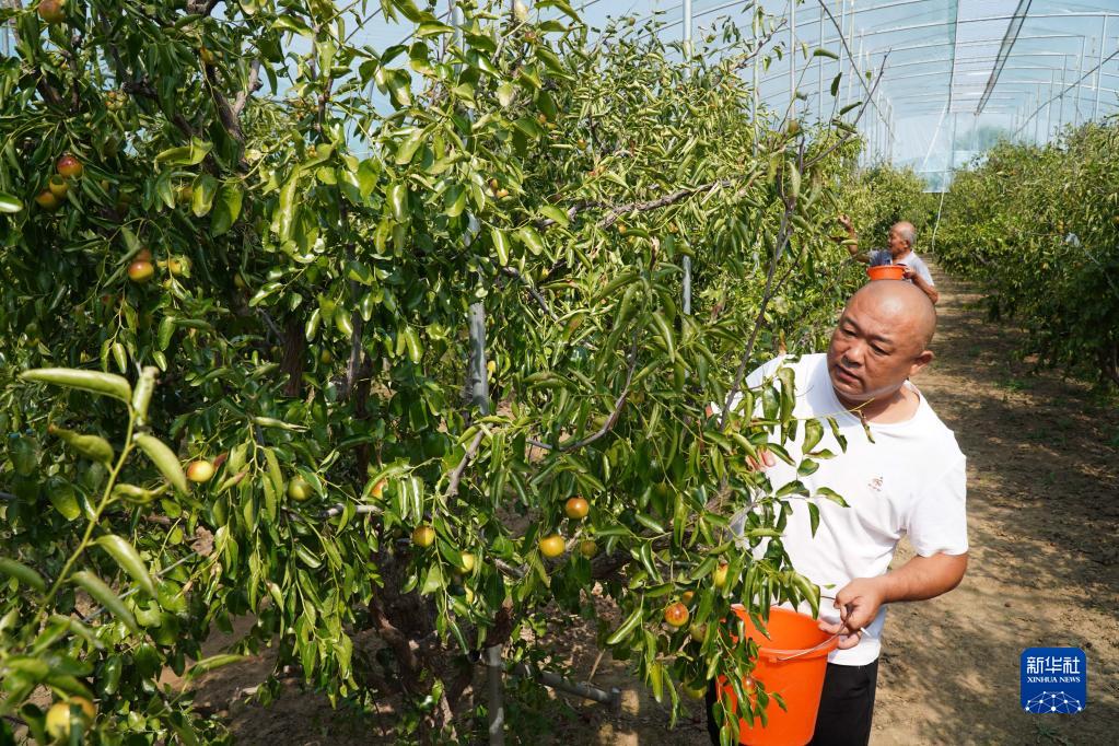 秋分前后,山東省濱州市沾化區大棚冬棗種植園內的冬棗開始大面積進入成熟期,棗農們忙著采摘成熟的冬棗,喜迎豐收。近年來,當地采取“黨支部+合作社+農戶”的方式,積極推廣大棚冬棗,帶動棗農抱團發展、實現增收致富,目前全區大棚冬棗種植面積達到5萬余畝。
