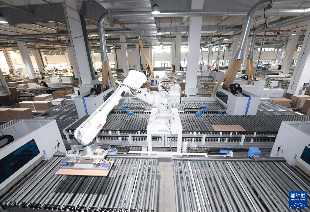 9月22日,在位于安吉縣的樂捷家居股份有限公司,機械臂在智能家具鉆孔工作站分放板材。