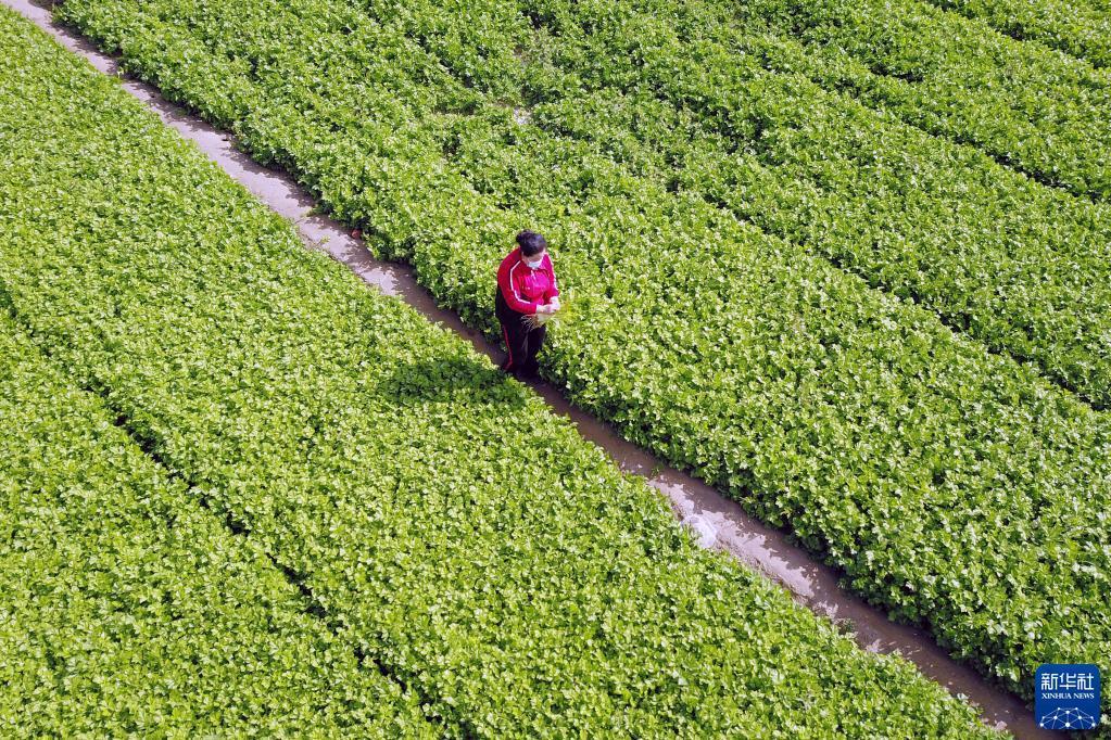 9月20日,在榆中祥龍蔬菜產銷專業合作社種植基地,豆俊蘭查看芹菜長勢(無人機照片)。
