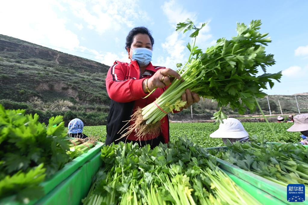 9月20日,在榆中祥龍蔬菜產銷專業合作社種植基地,豆俊蘭整理采收的芹菜。