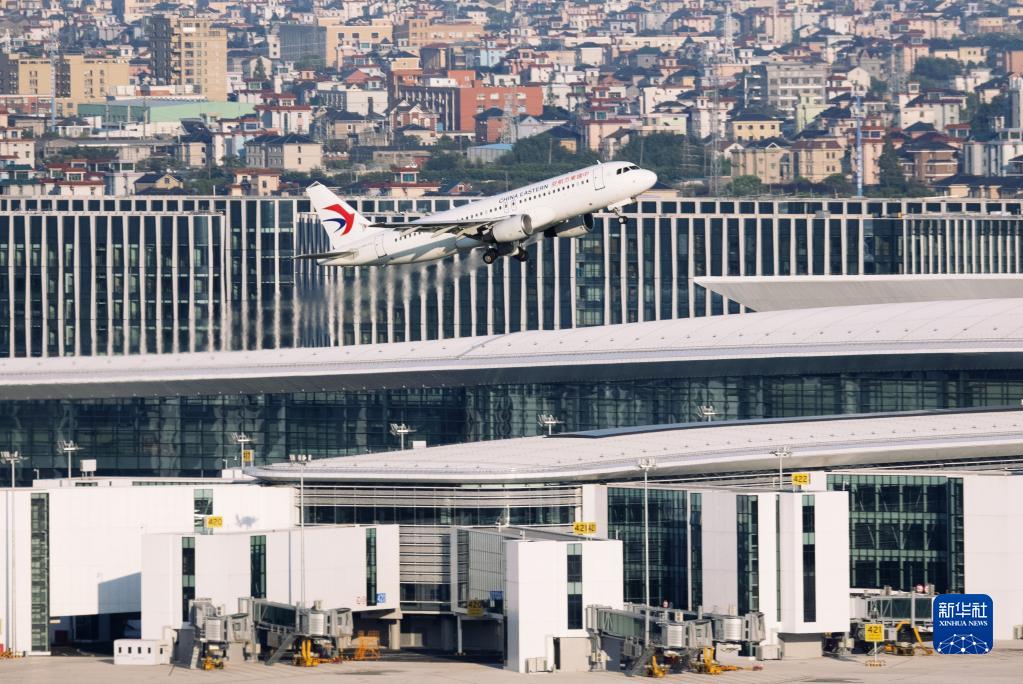 9月22日,一架東航客機從杭州蕭山國際機場三期T4航站樓前起飛。