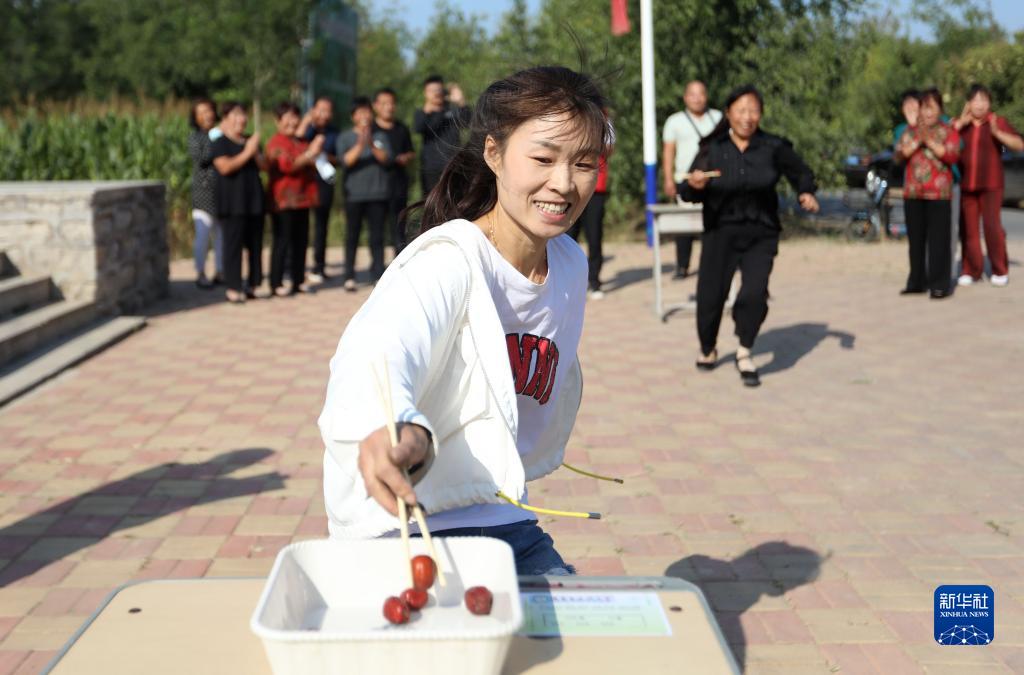 9月22日,河北省滄州市滄縣村民在進行“筷子夾棗”比賽。