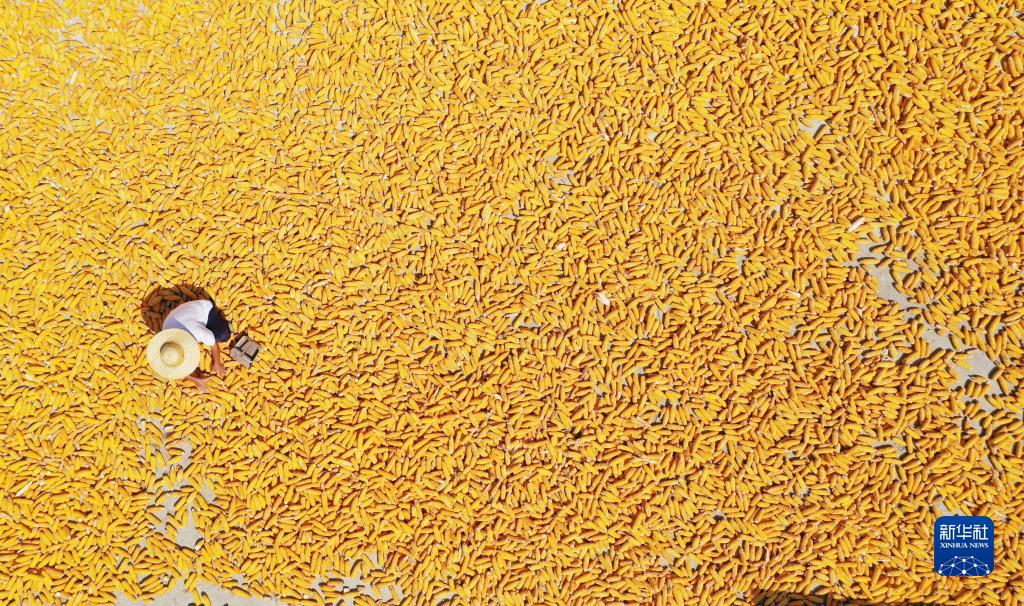 9月22日,在山東省臨沂市郯城縣郯城街道,農民晾曬收獲的玉米(無人機照片)。
