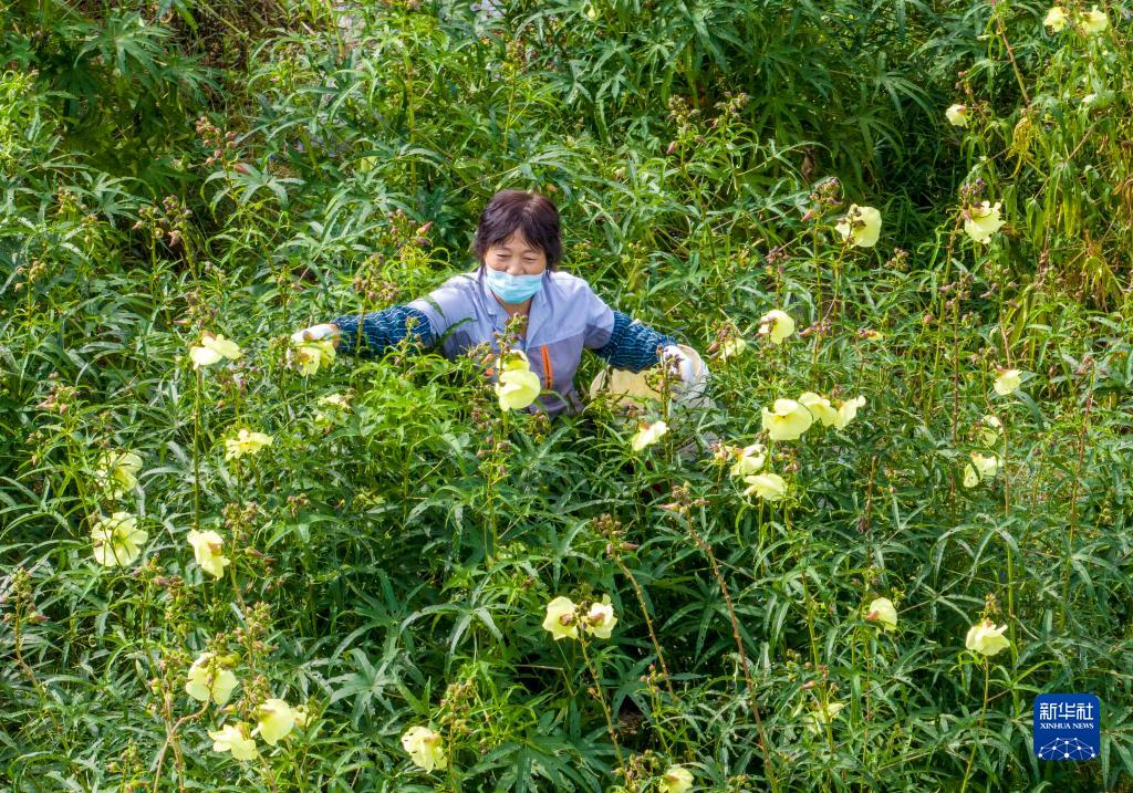 9月21日,江蘇省泰州市大泗鎮馬龍村村民在黃蜀葵種植基地采摘黃蜀葵(無人機照片)。