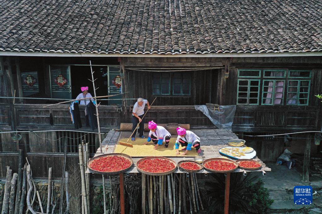 9月14日,在廣西龍勝各族自治縣龍脊鎮龍脊古壯寨,壯族群眾在晾曬谷子和辣椒。