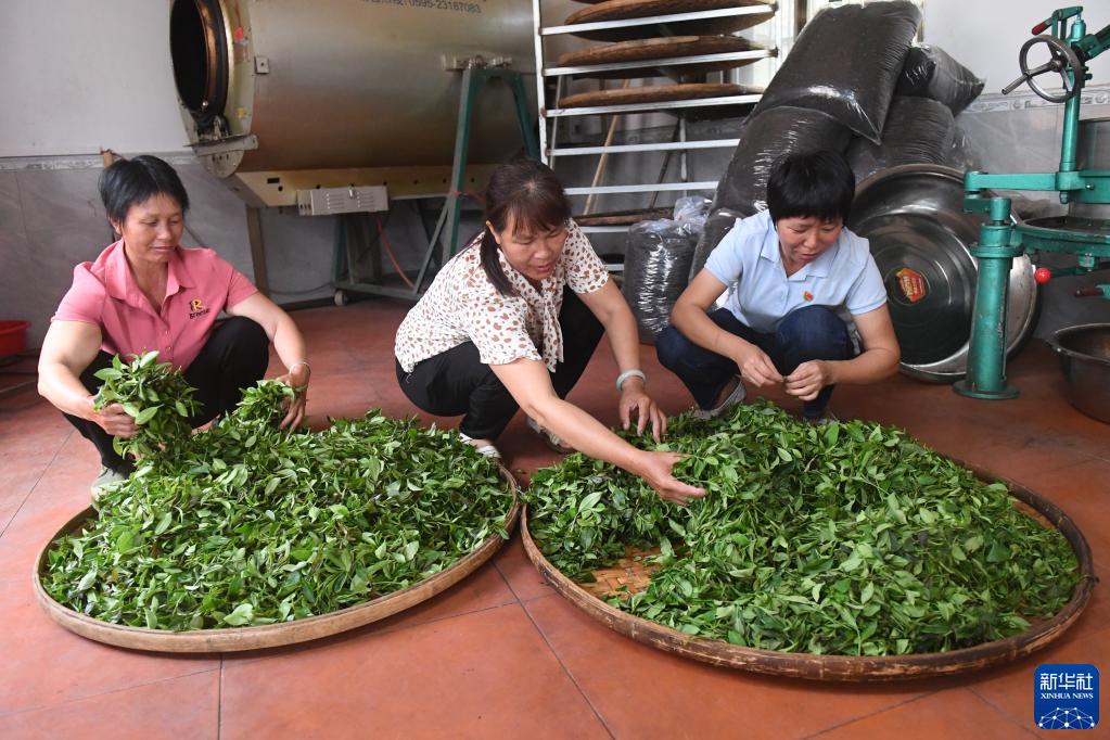 9月22日,在廣西蒼梧縣六堡鎮山坪村,村民在攤晾剛采摘回來的茶葉。