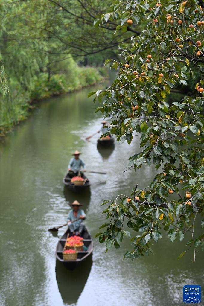 9月23日,西溪濕地的工作人員用船運送剛采摘的柿子。