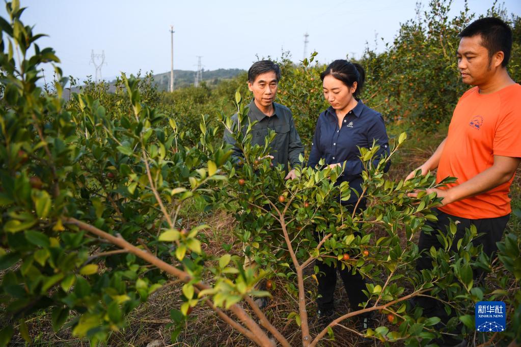 9月21日,在廣東韶關樂昌市梅花鎮梅花村,白拉曲珍(中)和師傅江建發(左)、同事伍國清在石漠化綜合治理的油茶種植基地查看油茶生長情況。
