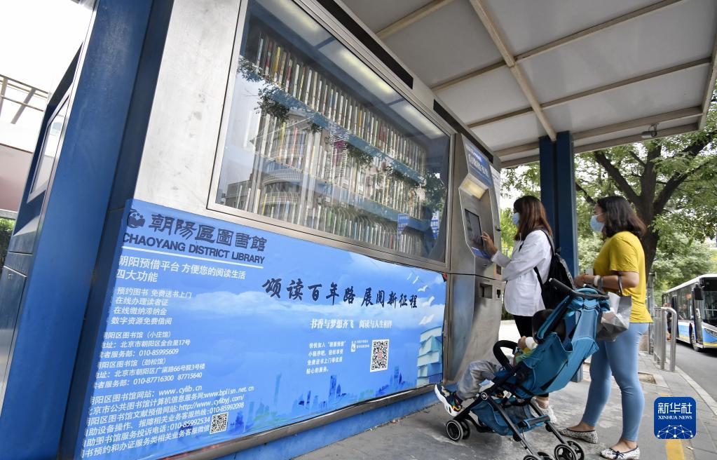 居民在北京市朝陽區街頭自助圖書館借書(9月19日攝)。