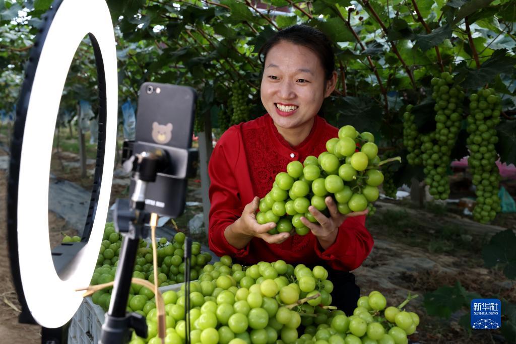 9月20日,在山東省棗莊市孟莊鎮大郭莊村,“90后”牛玲玉在葡萄園直播平臺上推介銷售陽光玫瑰葡萄。牛玲玉大學畢業后返鄉創辦了暢想家庭農場,其種植的葡萄因屬綠色食品備受消費者青睞。