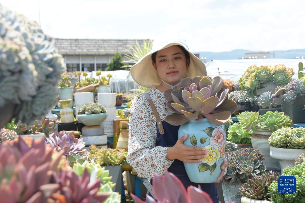 9月20日,在云南省紅河哈尼族彝族自治州蒙自市,“90后”創業青年王欣蕊在整理擺放多肉植物。王欣蕊大學畢業后返鄉從事多肉種植銷售。對她來說,多年積累下來的創業經驗,同她越做越好的“多肉事業”一樣,都是一份難得的收獲。