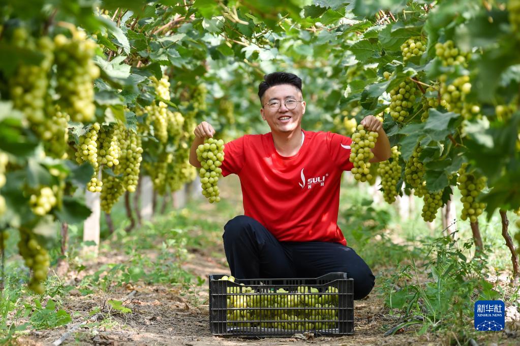 9月23日,在江蘇省宿遷市宿城區陳集鎮王莊村,“00后”汪碩展示剛采摘的無公害葡萄。汪碩2021年畢業后回到家鄉從事葡萄種植。近期,他種植的150畝葡萄進入豐收季。