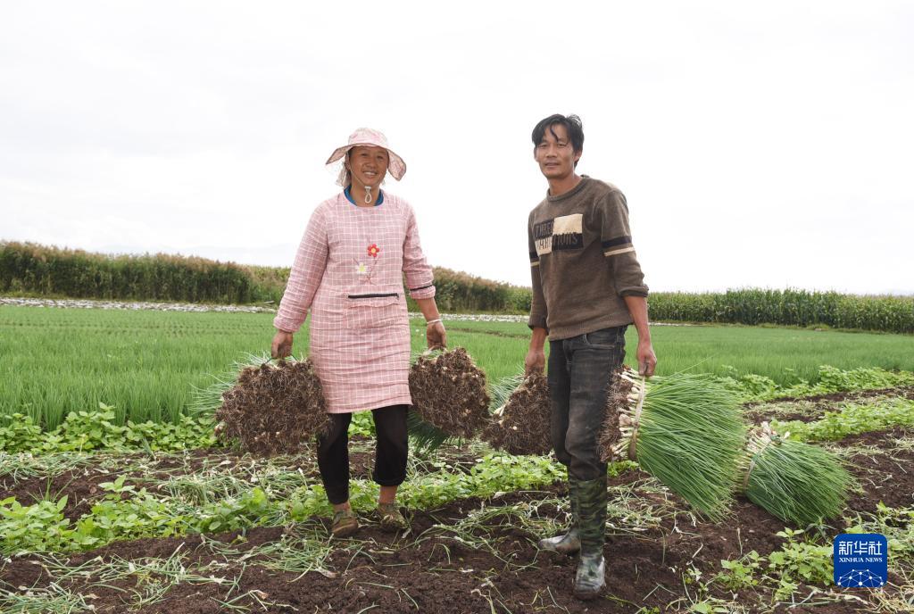 9月22日,在云南省麗江市玉龍縣黃山街道的農田里,“80后”菜農楊志萍(左)和王曉林(右)夫婦在采收小蔥。在租種的10多畝地上,夫婦倆主要種植小蔥、白菜、萵筍等高原生態綠色蔬菜,今年預計收入10多萬元。
