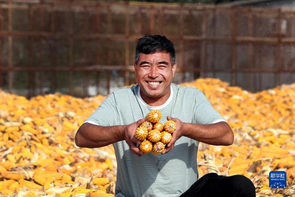9月22日,在河南焦作博愛縣磨頭鎮崔莊村,“70后”崔衛民展示今年豐收的玉米。2016年,崔衛民流轉土地600畝,經過6年辛勤耕耘,流轉土地達到1200畝。同時,他每年還收購周邊40個村莊6000多畝的糧食作物。