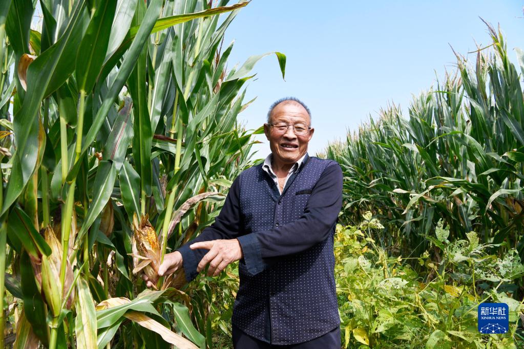 9月22日,在山東棗莊山亭區城頭鎮江時村,“40后”農民江哲建手指自家即將收獲的帶狀復合種植的玉米。農民江哲建今年帶頭推廣大豆玉米帶狀復合種植技術。近日,他家的160畝玉米大豆長勢良好。