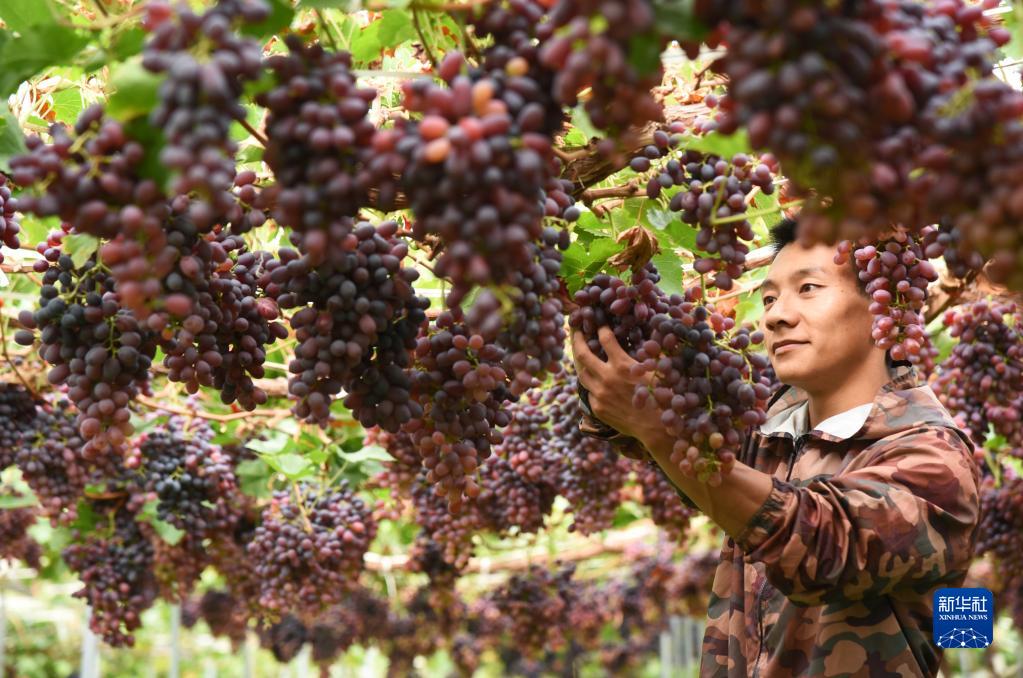 9月19日,在云南省麗江市古城區大研街道文智社區,“90后”李聰在創業果園里采摘葡萄。2021年9月,李聰在文智社區租地自主創業,種植了10畝葡萄,發展集休閑、觀光為一體的農家采摘園。今年預計收入近20萬元。