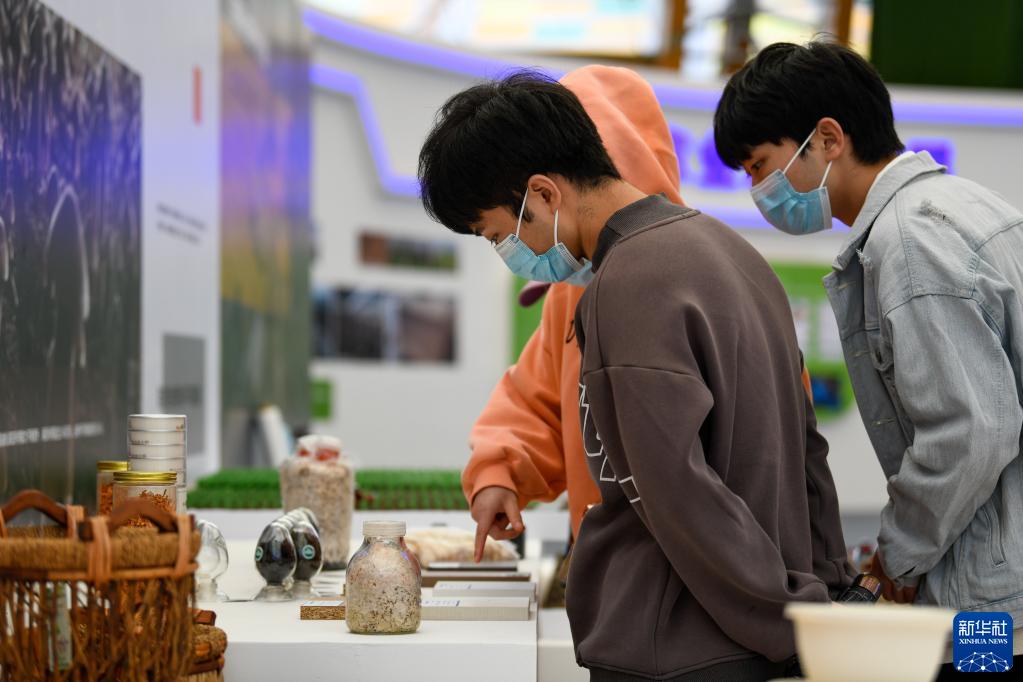 9月23日,在四川省成都市天府農業博覽園“大國糧倉科技館”內,市民在參觀秸稈做基質種植大球蓋菇。