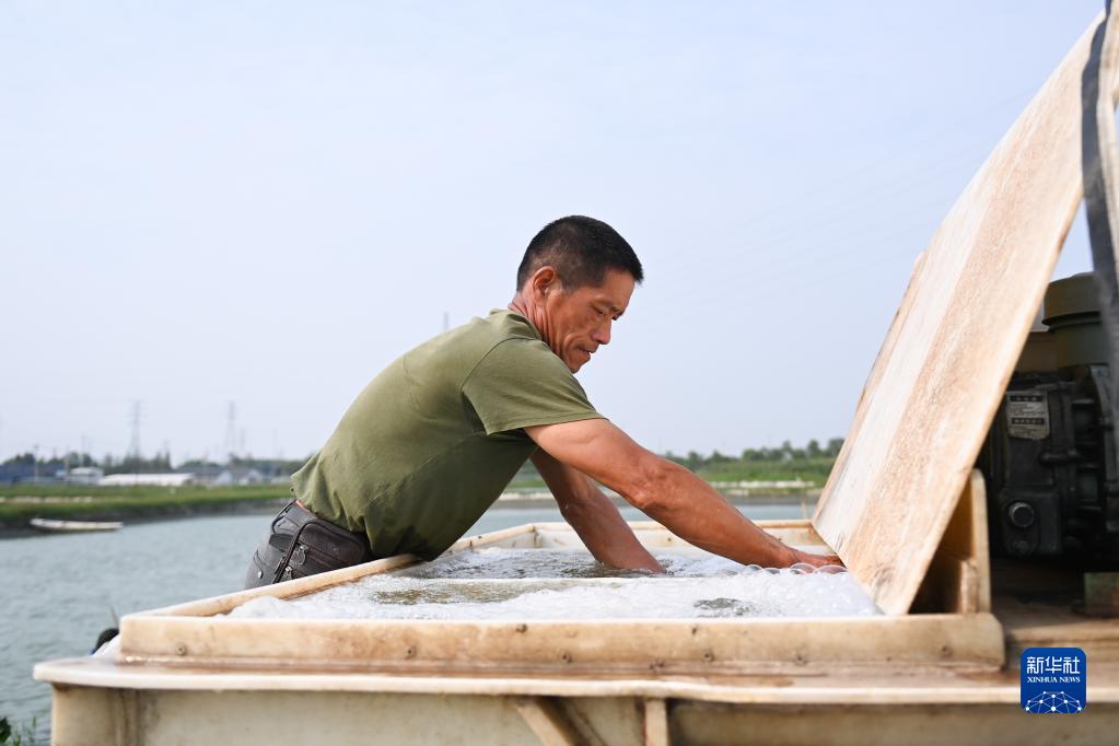 近日,浙江省湖州市吳興區八里店鎮豐盛灣水產養殖基地迎來沼蝦收獲季,工人們在蝦塘中圍網、捕獲、分揀、裝車,展現出一幅具有江南水鄉特色的豐收圖景。