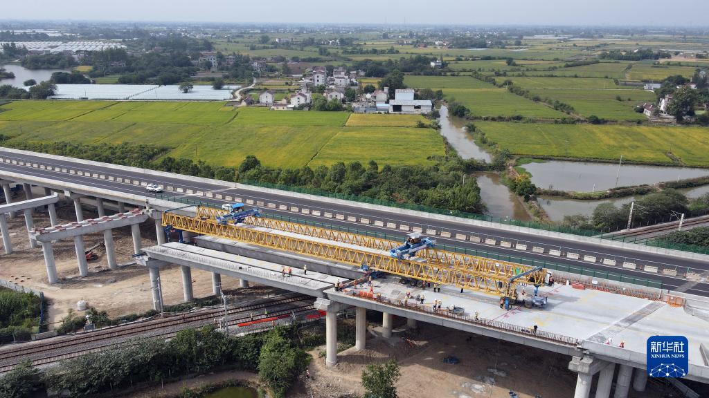 9月23日拍攝的蕪合高速公路上跨淮南鐵路箱梁架設施工現場(無人機照片)。