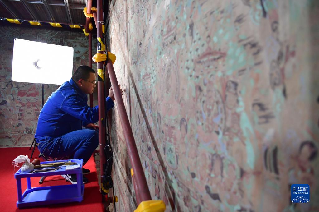 敦煌研究院文物保護技術服務中心壁畫修復師楊金禮在莫高窟第231窟內修復出現病害的壁畫(2022年4月19日攝)。新華社記者 陳斌 攝
