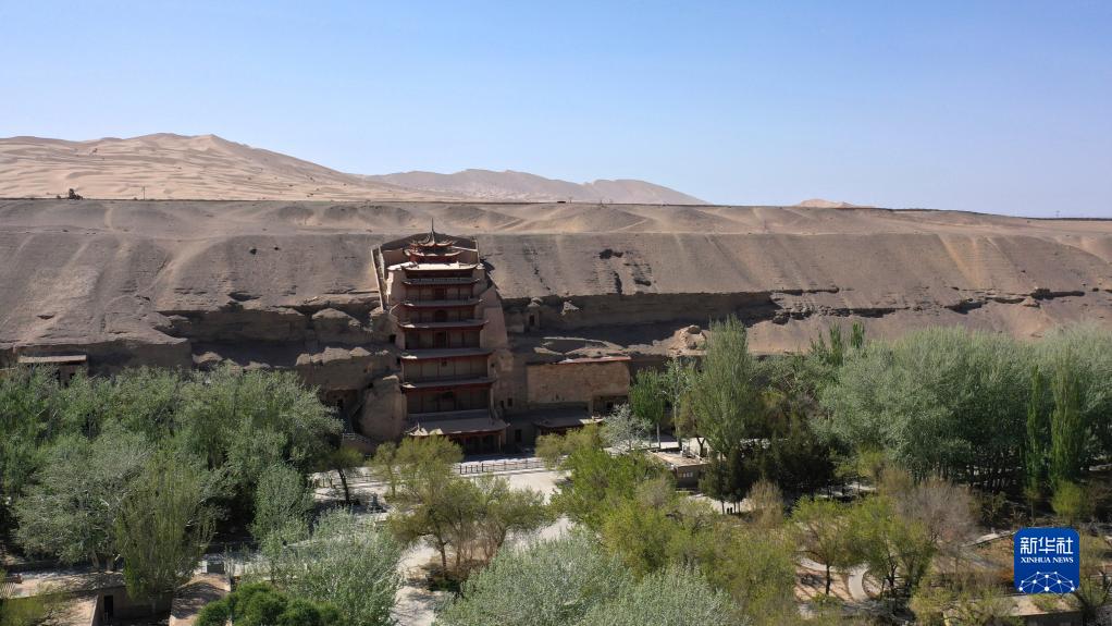 這是世界文化遺產莫高窟的標志性建筑——第96窟窟外木構建筑九層樓(2022年4月18日攝,無人機照片)。新華社記者 陳斌 攝