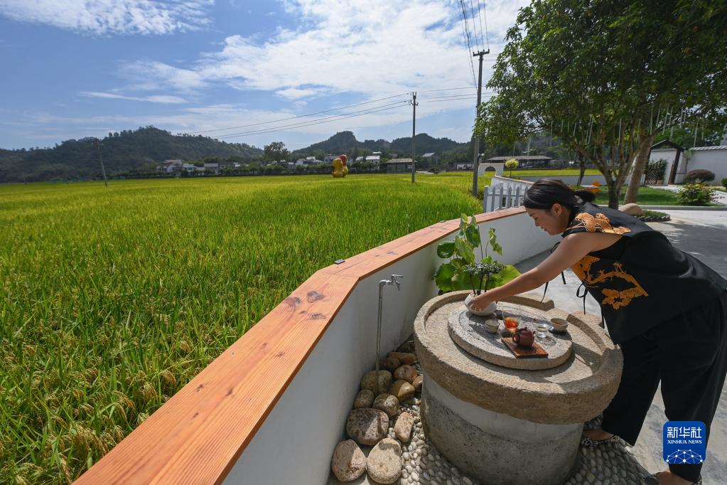 9月24日,羅虹在太陽鎮太陽村稻田邊的“稻香別院”特色餐廳院子內擺放茶具。今年上半年羅虹與合伙人一起在太陽鎮太陽米稻田基地旁邊租下一幢空置的房屋,打造集田園觀光、休閑、餐飲為一體的稻香特色餐廳。
