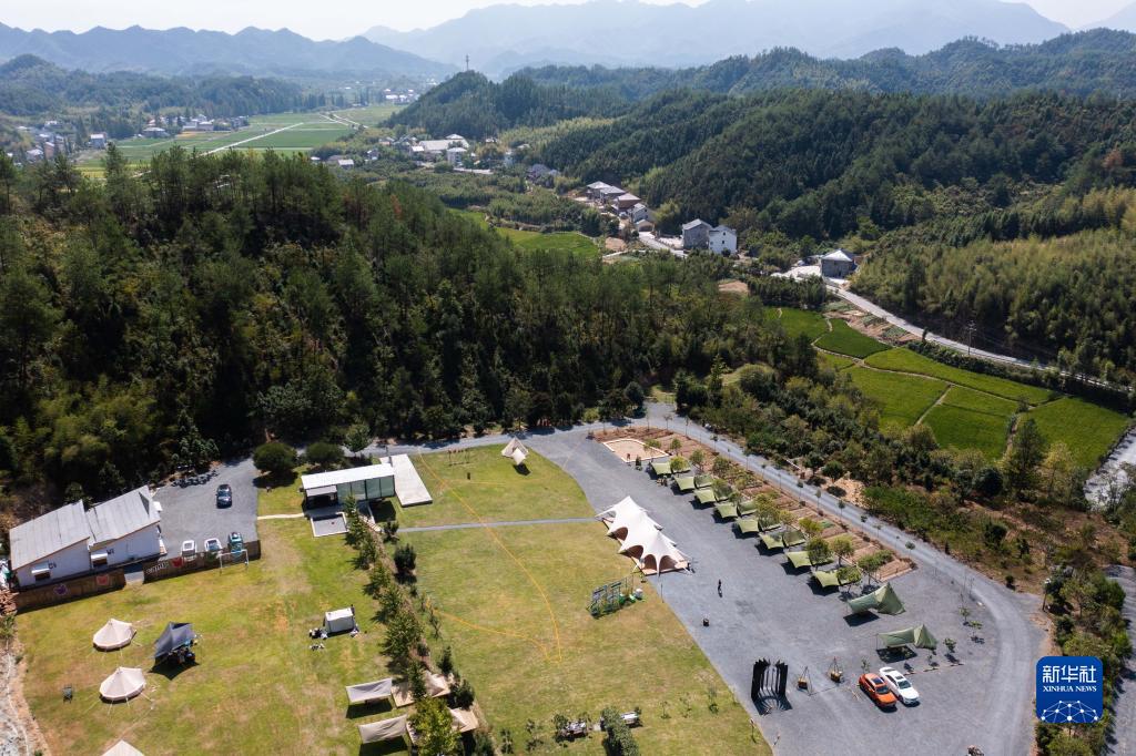 9月24日,空中俯瞰位于杭州市臨安區太陽鎮上莊村的牧光谷露營基地,該基地是2022年5月剛投入運營的網紅露營基地,帶動周邊30余名農戶就業(無人機照片)。