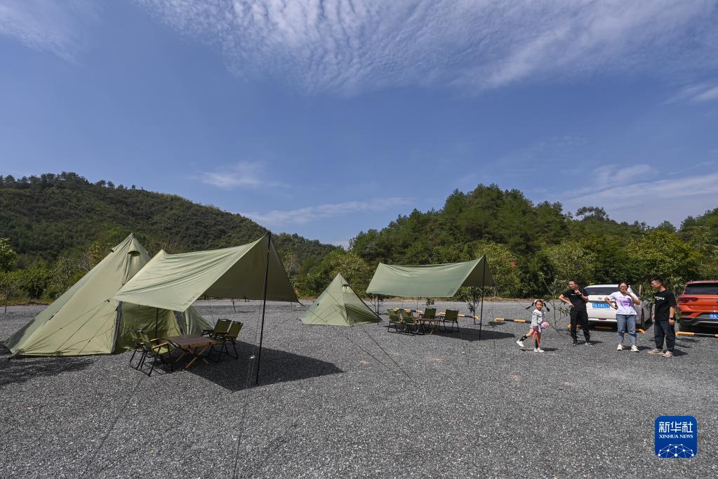 9月24日,在杭州市臨安區太陽鎮上莊村的牧光谷露營基地,“90后”負責人何威(右一)在和游客互動。該基地是2022年5月剛投入運營的網紅露營基地,帶動周邊30余名農戶就業。