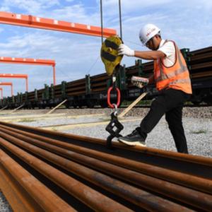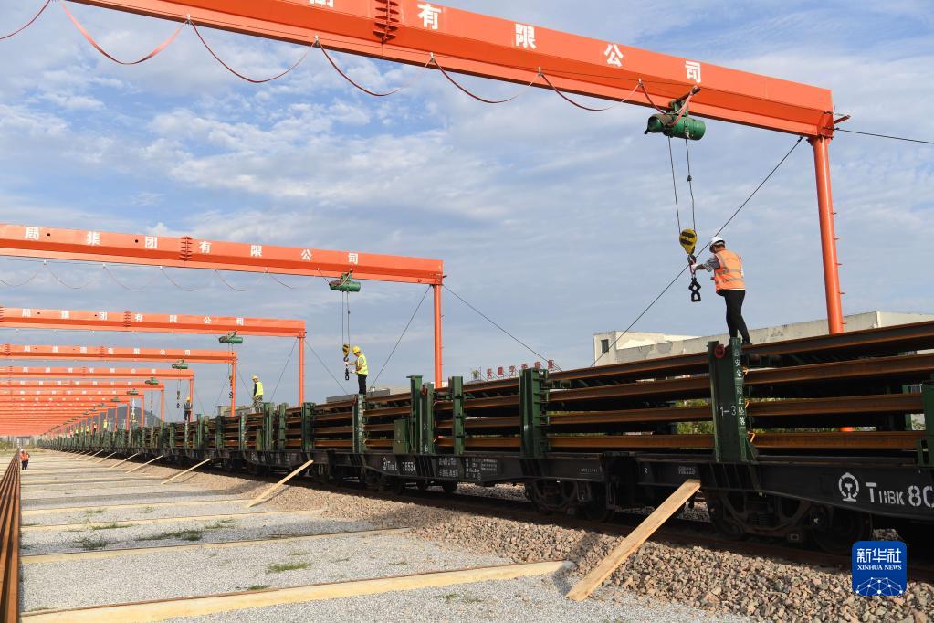 9月24日,在中鐵十一局池黃鐵路鋪軌基地,工作人員進行卸軌作業。