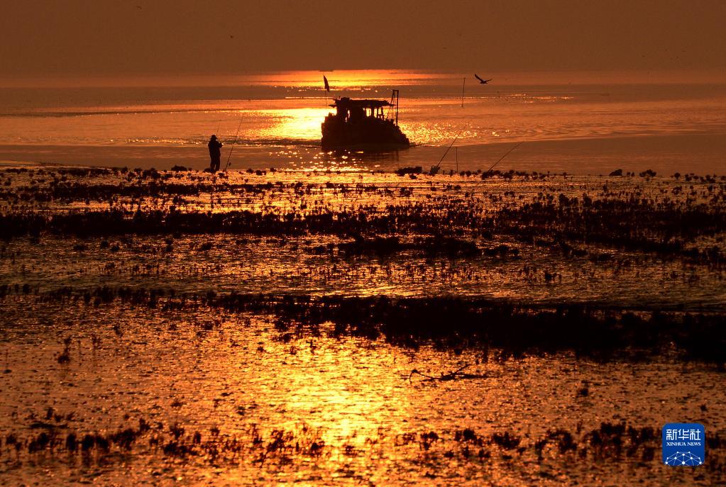 9月18日在山東黃河三角洲國家級自然保護區拍攝的夕陽下的濕地景色。
