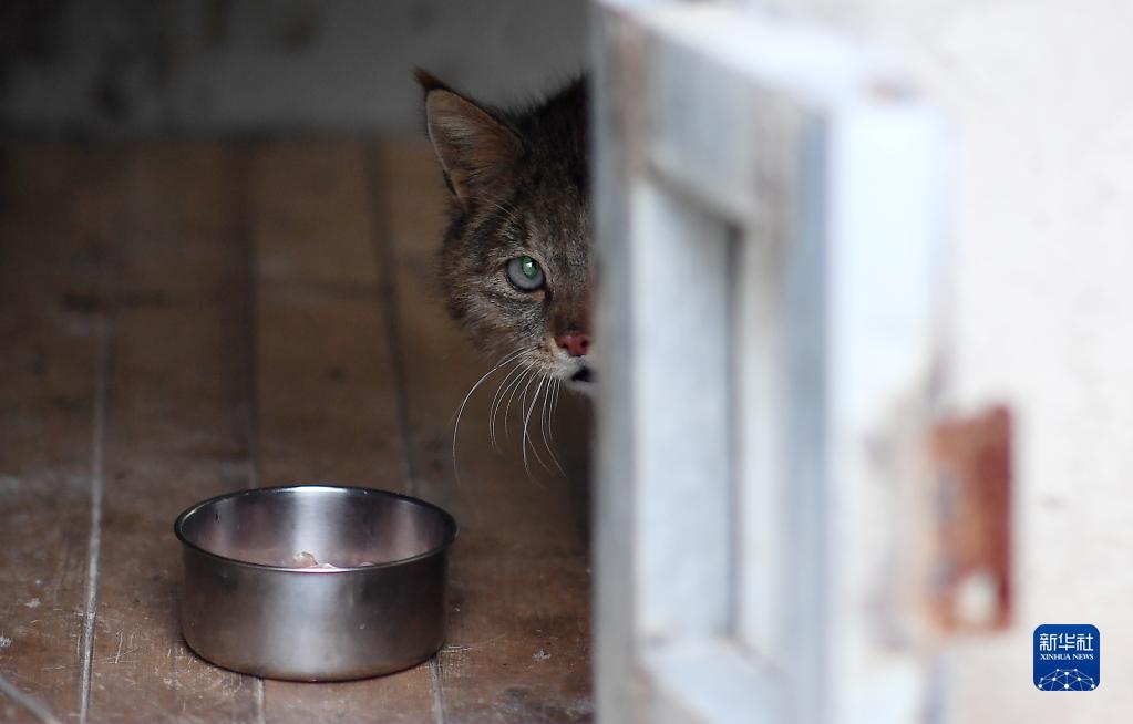 9月18日,受救護的荒漠貓在青海野生動物救護繁育中心準備進食。