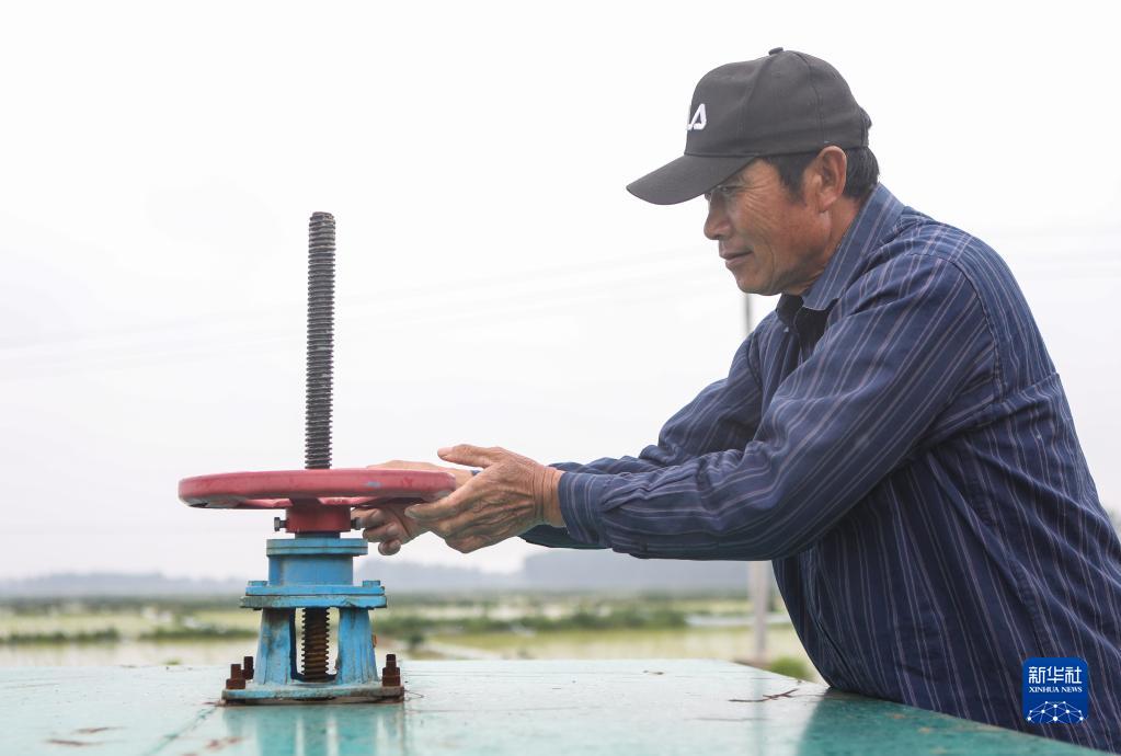 王炳軍在操作灌溉稻田的設備水閥(2022年6月13日攝)。